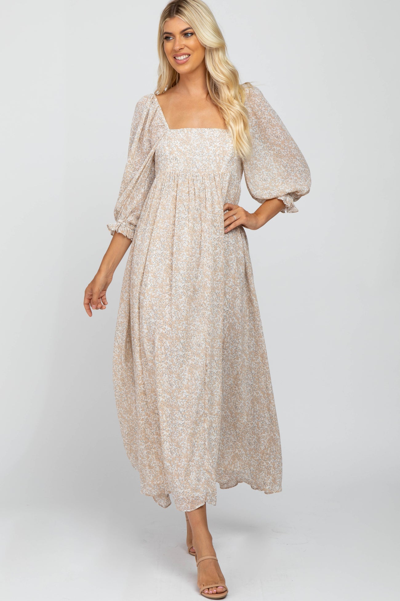 Beige Chiffon Printed Square Neck Empire Maxi Dress