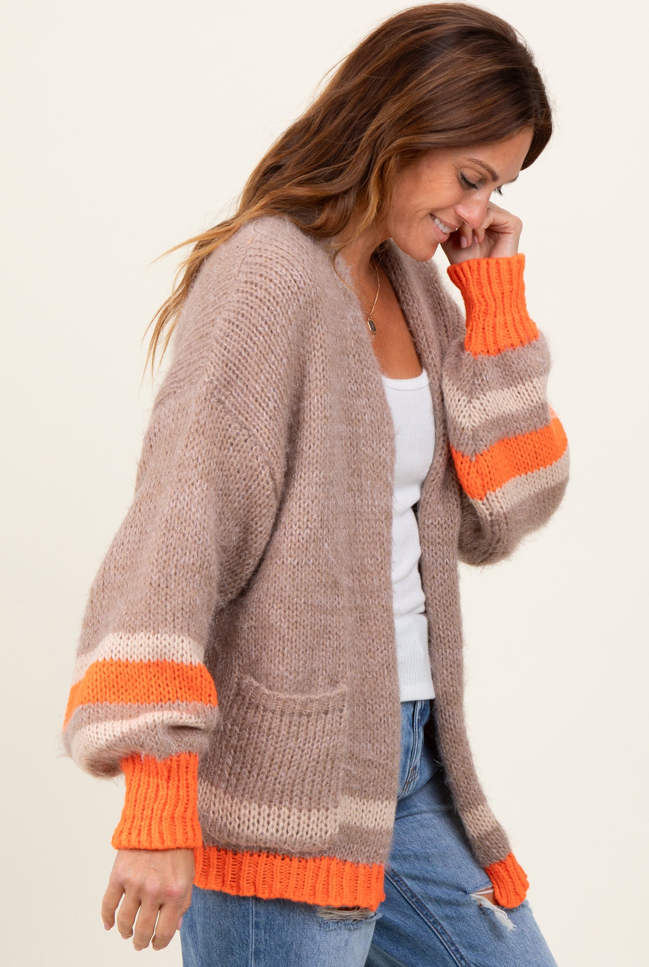 Cozy up in style with our Beige Chunky Knit Stripe Detail Sweater Cardigan. This oversized cardigan features a soft, chunky knit construction in a warm beige tone, accented by bold orange and cream stripes on the voluminous sleeves and hem for a pop of color. Designed with an open front and relaxed fit, it’s perfect for layering over your favorite casual outfits. The ribbed cuffs and hem add extra comfort and shape, while front pockets bring functionality. Pair with jeans and a tee for effortless, laid-back chic. Embrace warmth and standout style this season!
