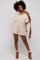 A corduroy romper with front functioning buttons, a collar, long drop shoulder sleeves, front pockets, and a cuffed hem.