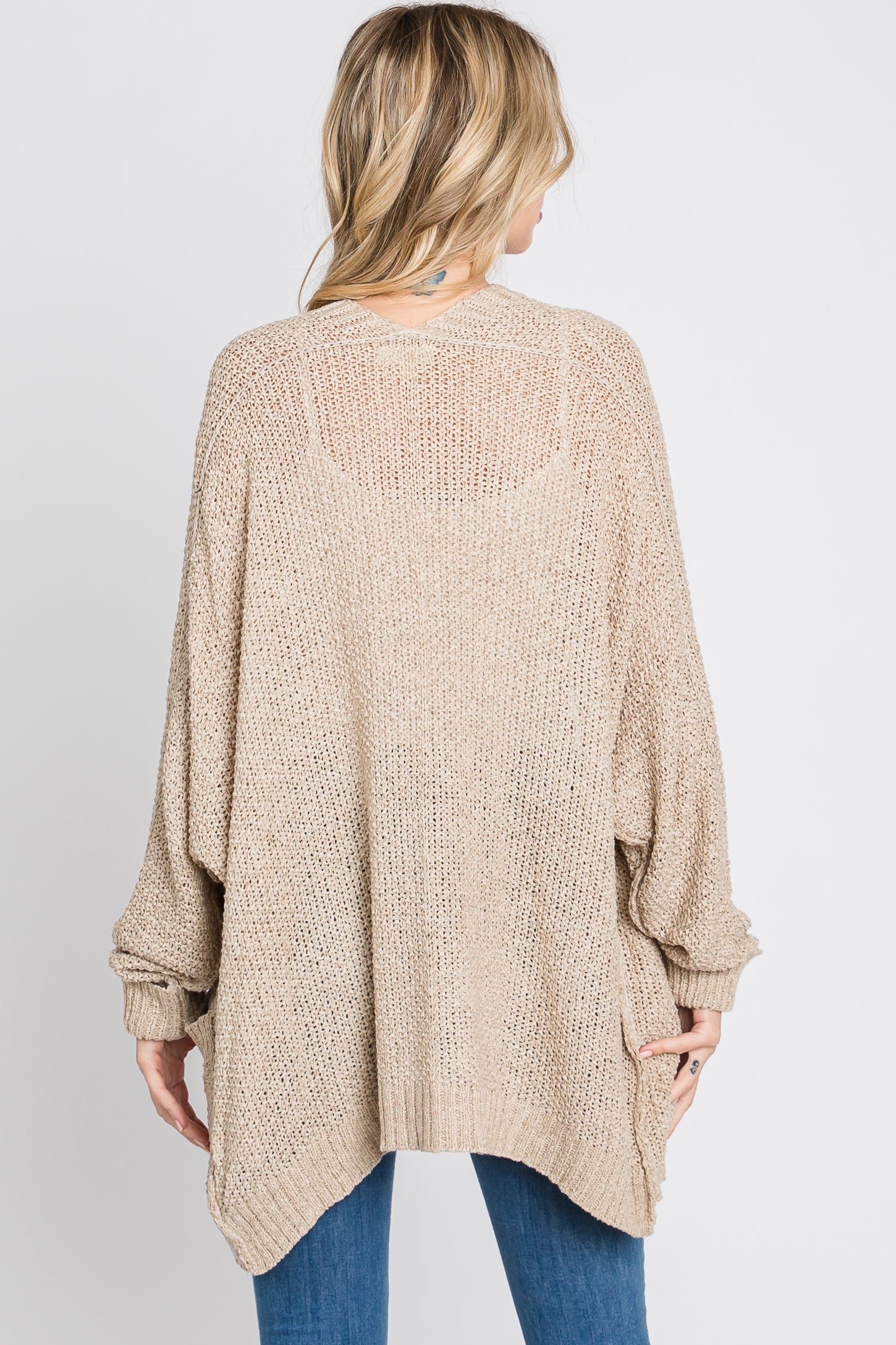 A cardigan featuring front pockets, an open front and dolman cuffed long sleeves.