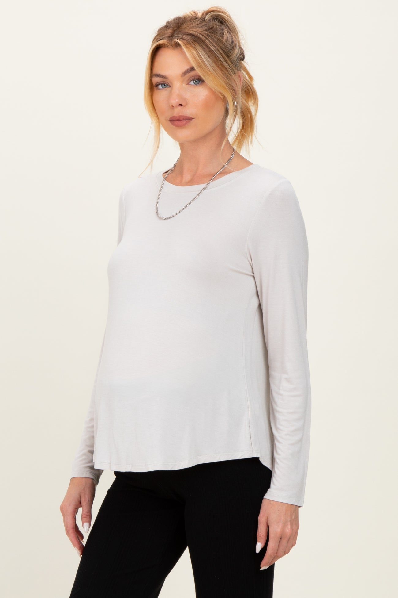 Beige Flowy Round Hem Maternity Long Sleeve Top