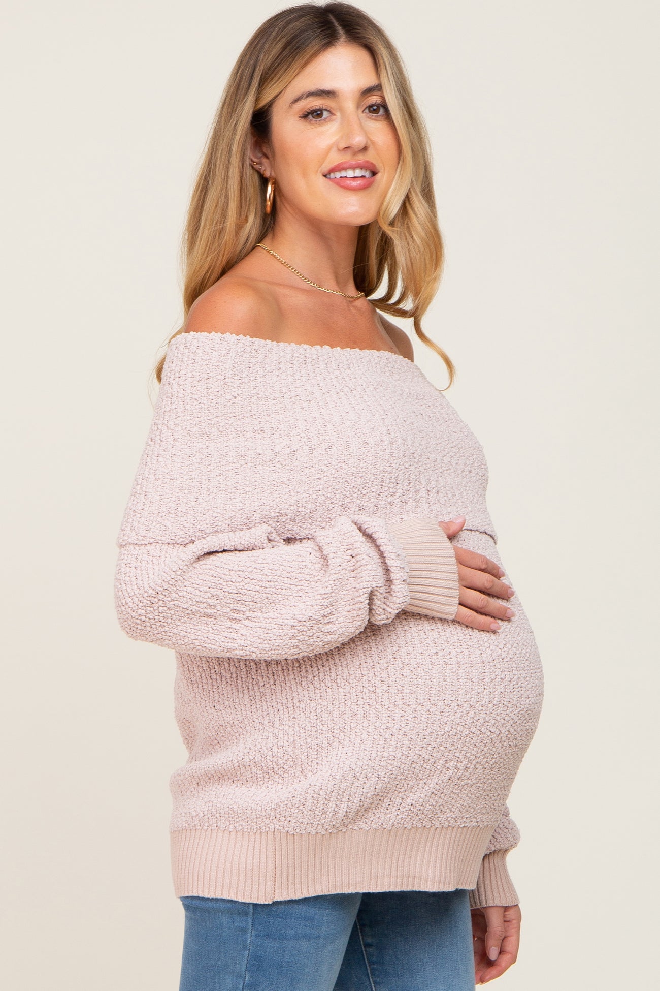 Beige Foldover Off Shoulder Maternity Sweater