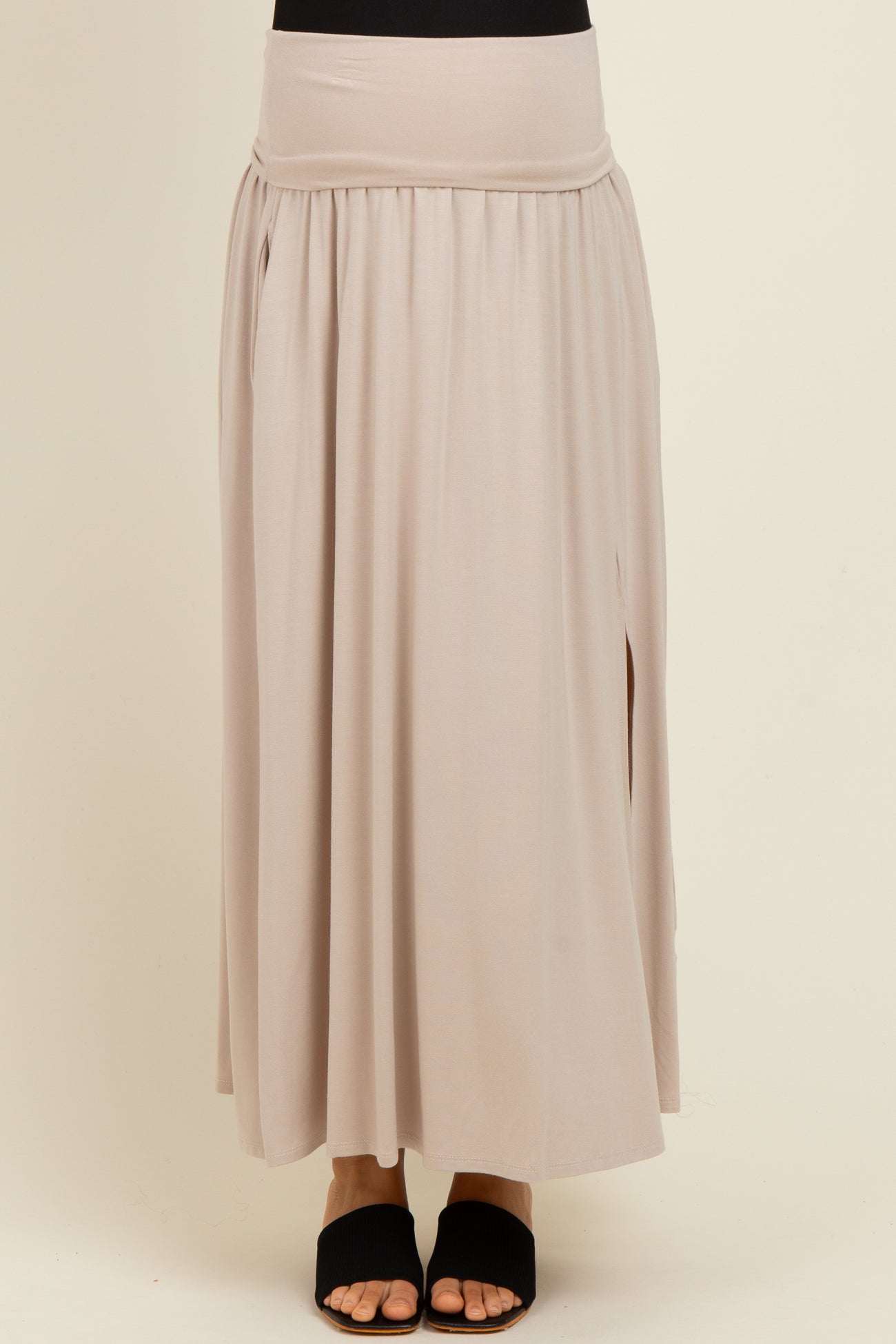 Beige Foldover Waist Side Slit Maternity Maxi Skirt