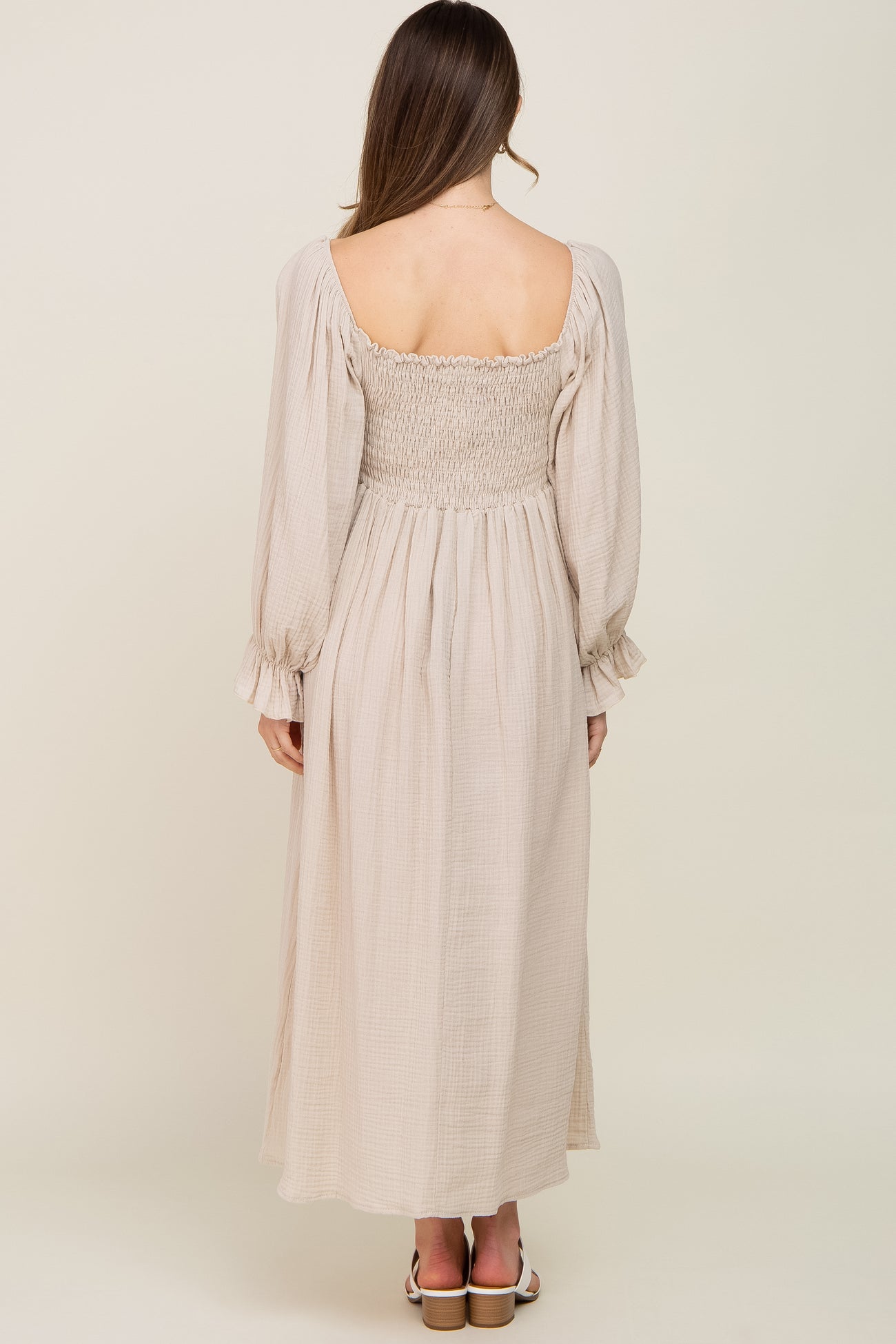 Details A lightweight maternity midi dress with a squared neckline, long cinched sleeves, and a smocked top. Content + Care