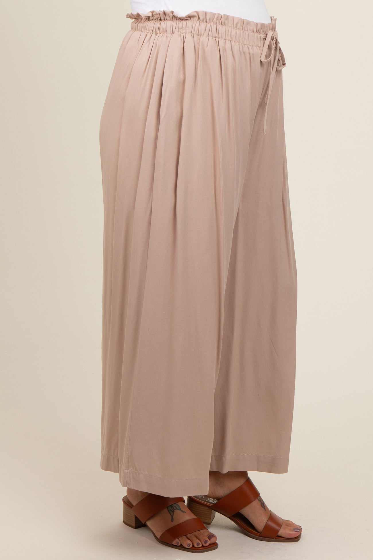 Beige Pleated Elastic Waist Wide Leg Crop Maternity Pants