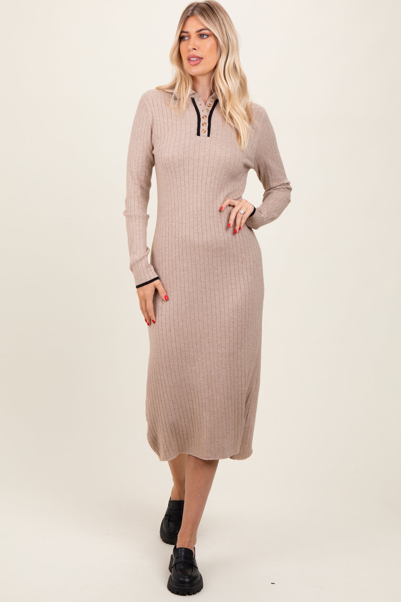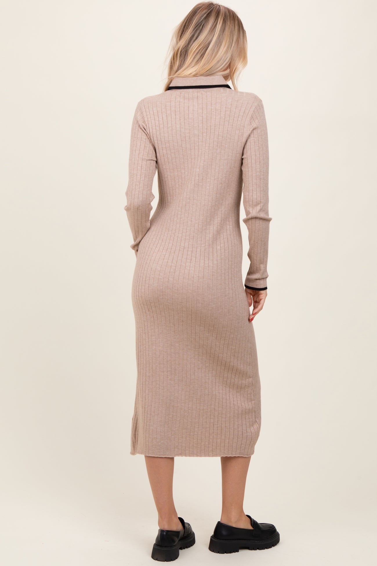 Beige Ribbed Contrast Trim Polo Midi Sweater Dress