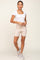 A pair of ribbed biker shorts featuring a crisscross waistband.