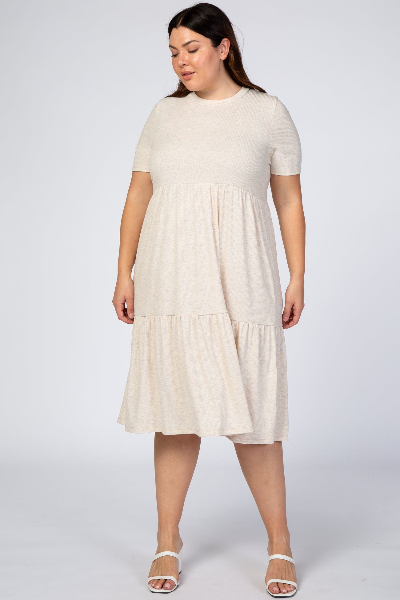 A solid ribbed short sleeve maternity plus dress with scoop neckline and tiered body.