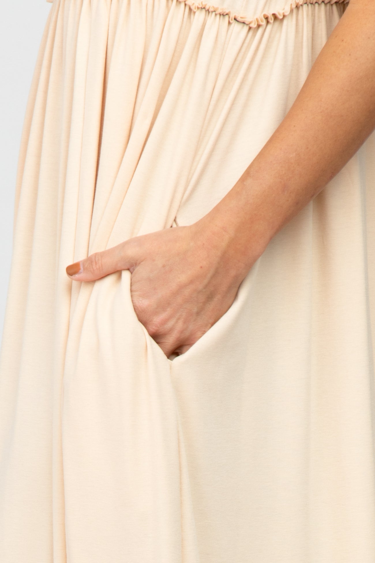 Details A thick knit maxi dress featuring a crew neckline, short sleeves, an empire waist with ruffle trim and side pockets. Content + Care