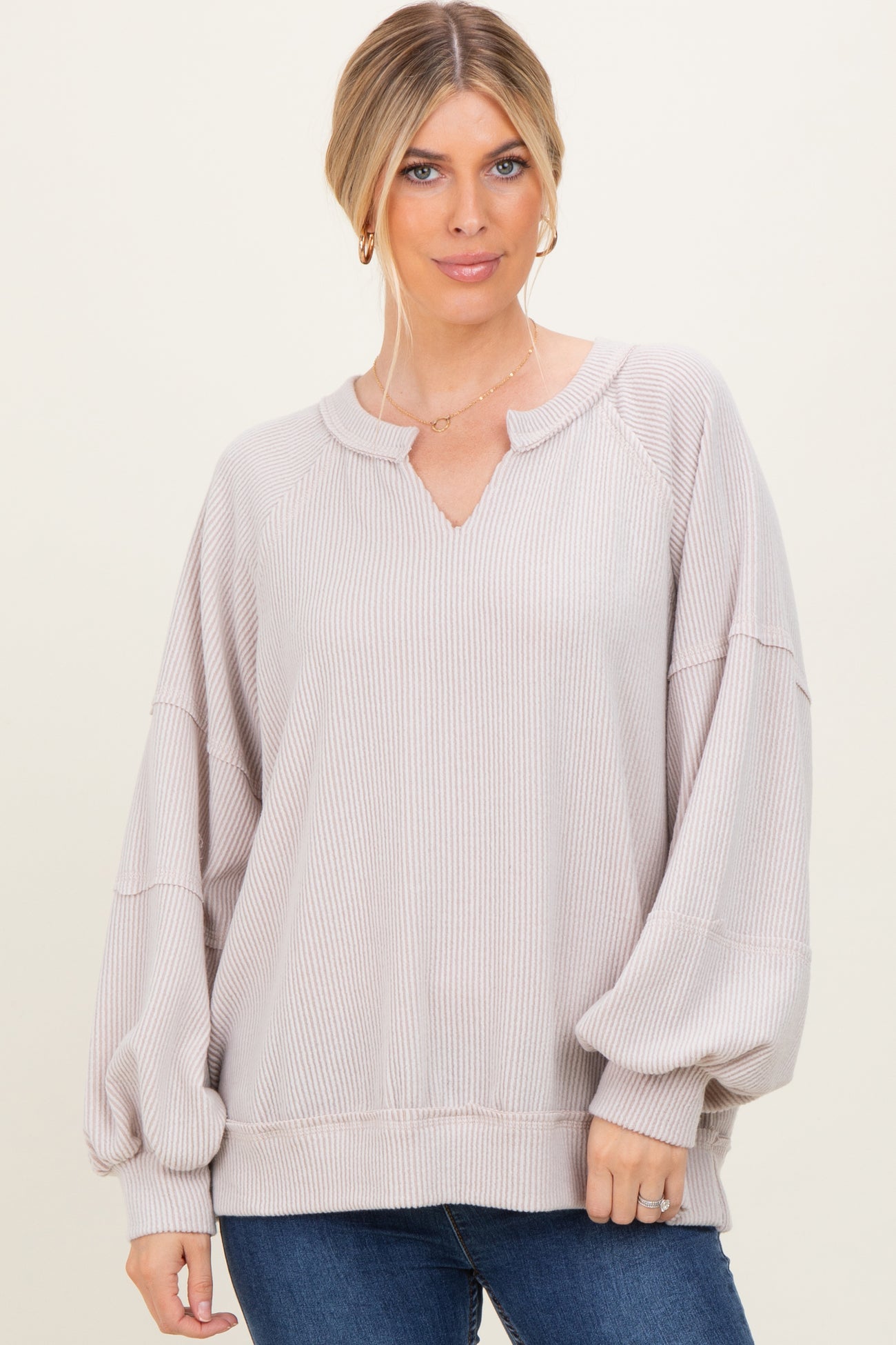Beige Solid Rib Long Sleeve V-Neck Oversized Tunic Top