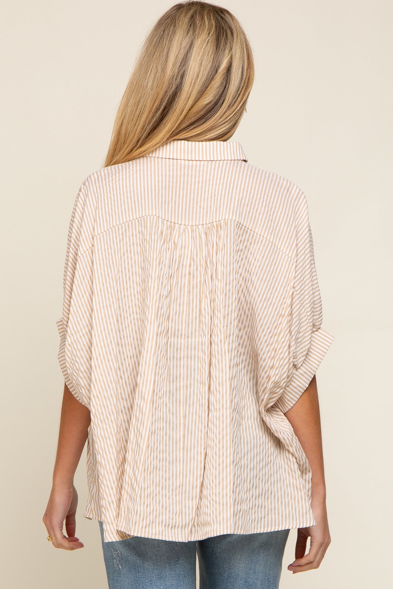Details A striped maternity top. Features collared neckline, dolman sleeves, button front closure, and dolman sleeves. Content + Care