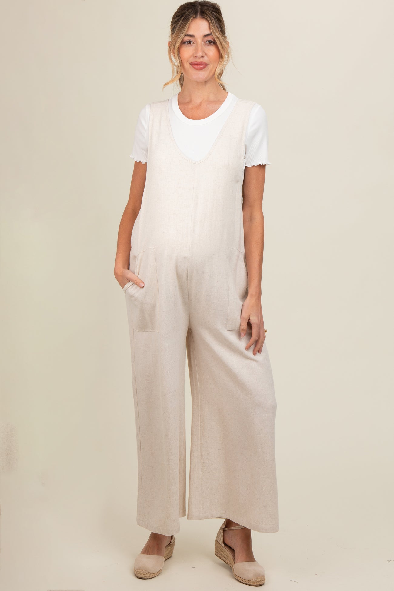 Beige V-Neck Wide Leg Maternity Jumpsuit