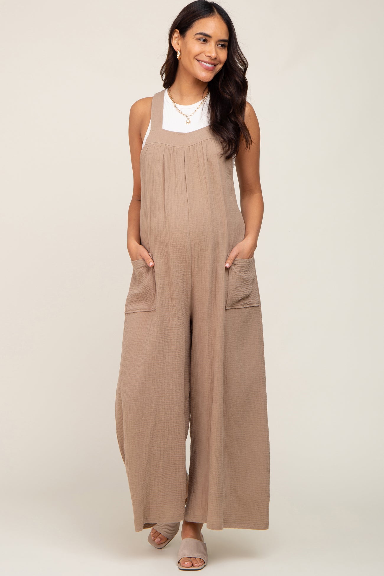 Beige Wide Leg Tie Back Maternity Overalls
