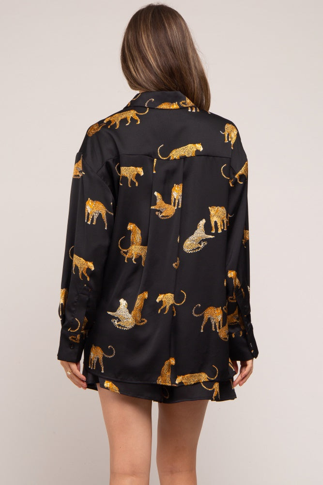 Details A printed maternity long sleeve blouse and shorts set in a silky material. Features collared neckline and button down front on top and drawstring elastic waistband with pockets on shorts. Content + Care