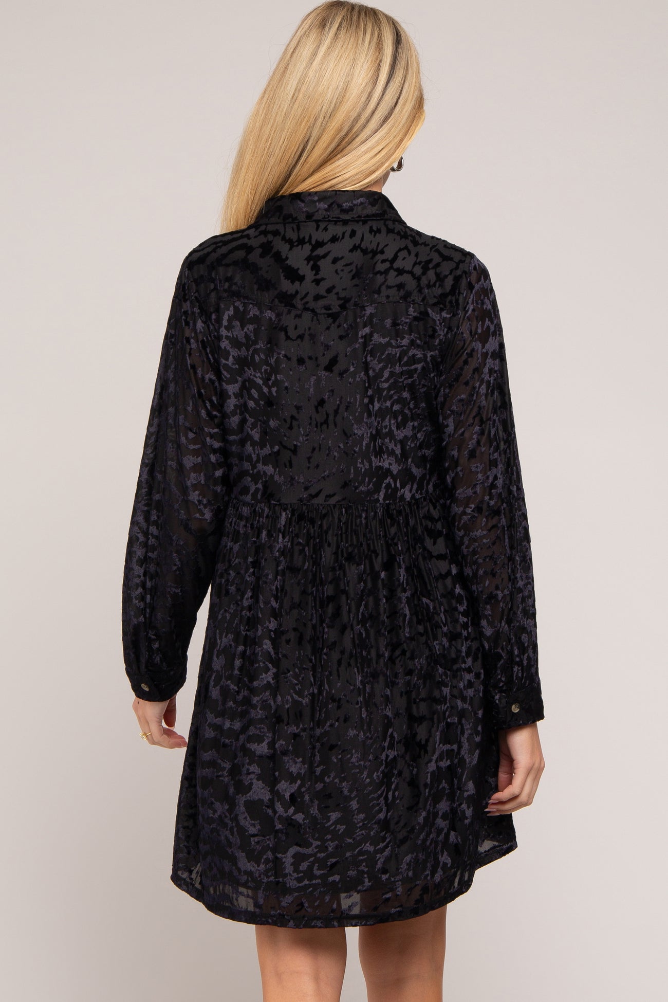 A burnout velvet maternity dress featuring a collar, front functioning buttons, and long cuffed sleeves. The body of the dress is lined.