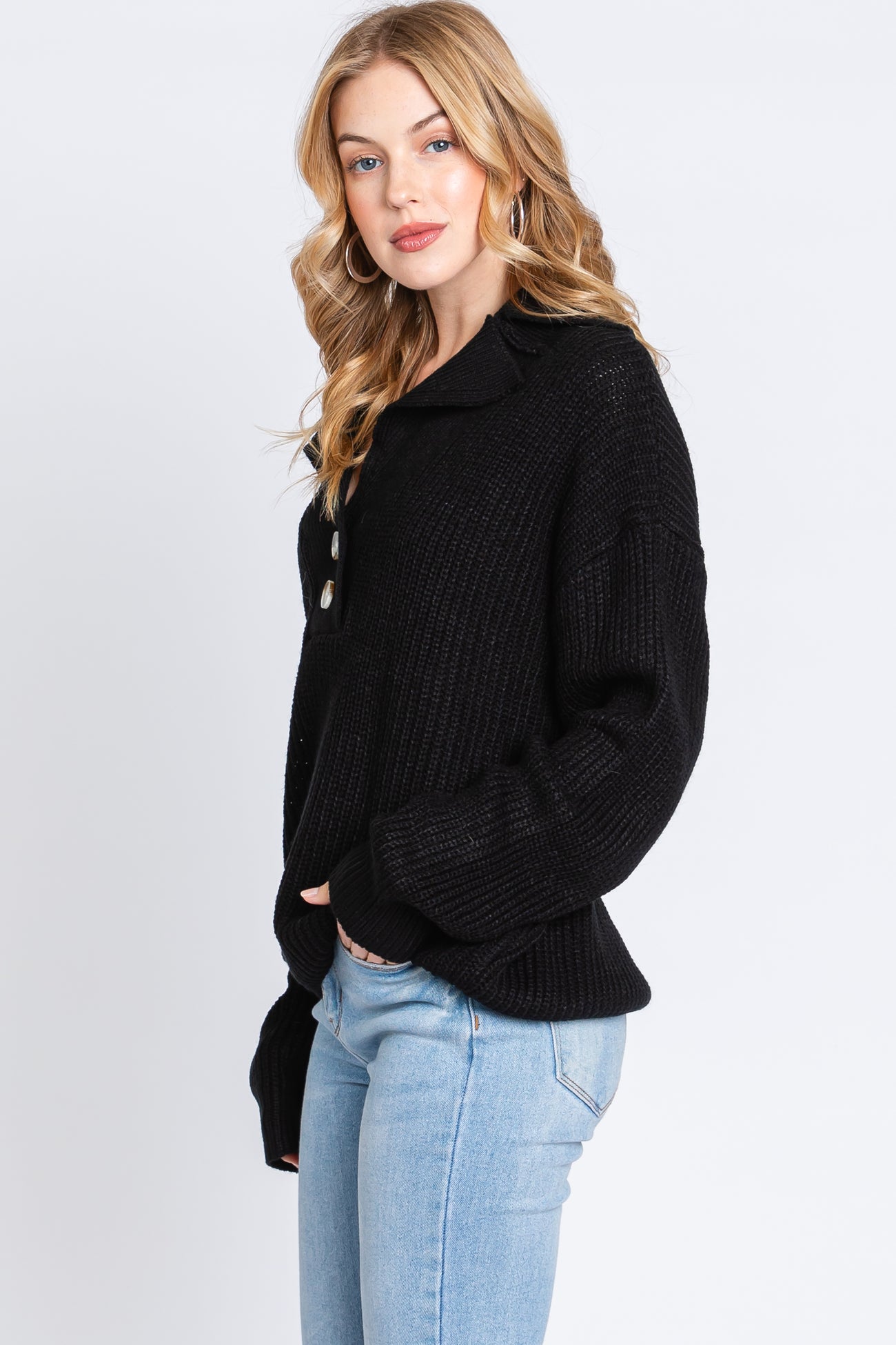 Details A chunky knit sweater featuring a notched collar, top functioning buttons, and long drop shoulder sleeves. Content + Care
