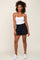 A pair of solid active shorts featuring a curved slit hem and an elastic waistband.