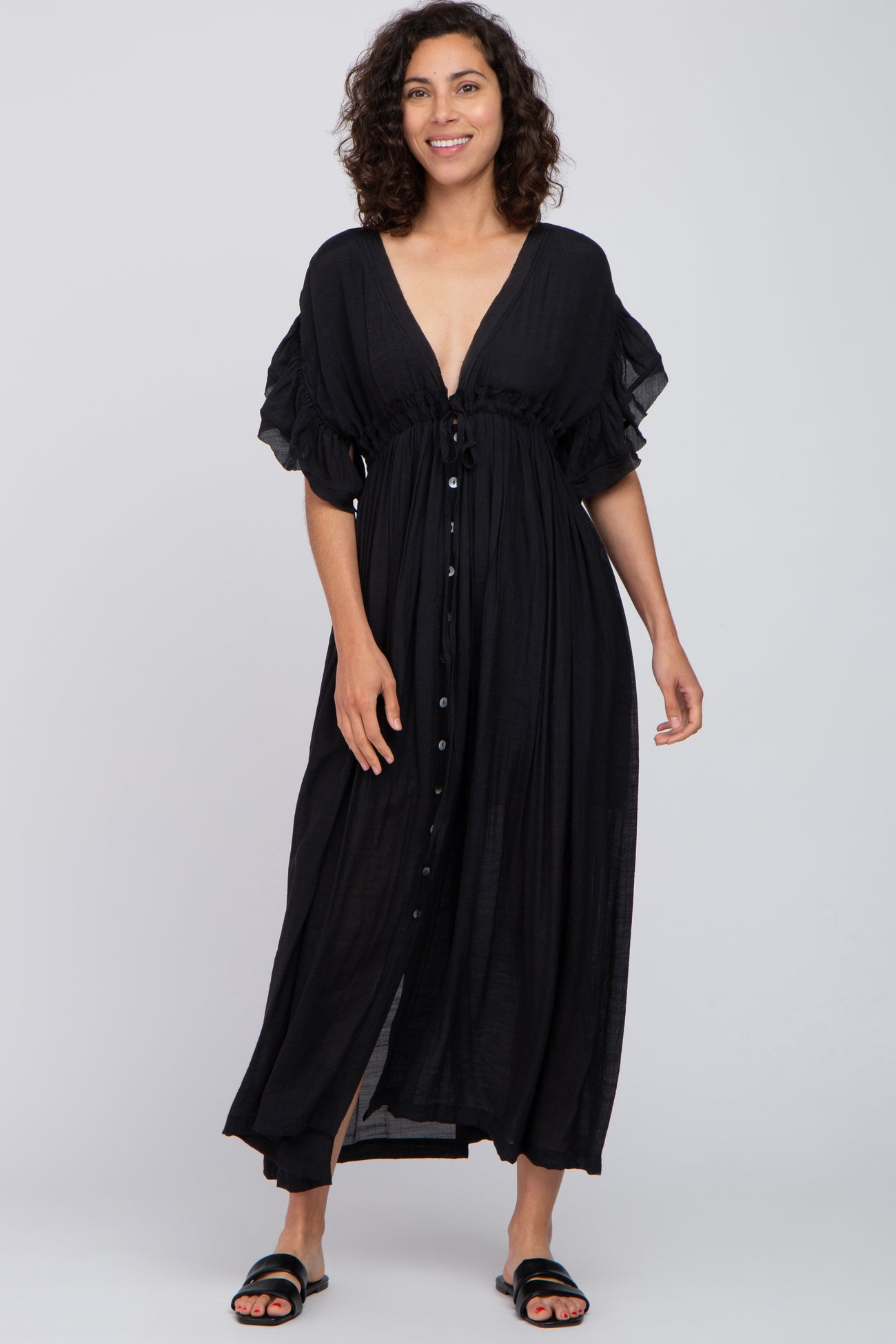A solid short sleeve maxi dress with a deep v-neckline, ruffle accent sleeves, button down closure in front and tie accent in back. Skirt is partially lined. Pocketed.
