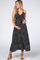 A dot print maternity midi dress featuring ruffle, crochet lace and self tie detail in front, smocked back and adjustable thin straps.