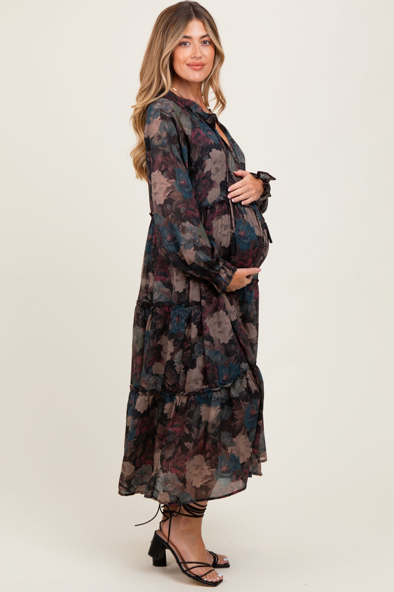 Black Floral Chiffon Ruffle Tiered Maternity Midi Dress