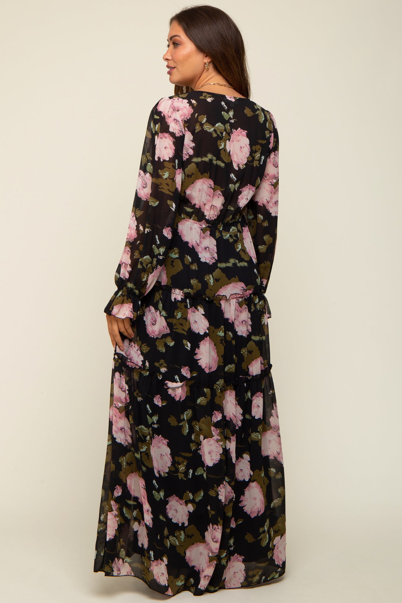 Black Floral Chiffon V-Neck Lettuce Edge Tiered Maternity Maxi Dress