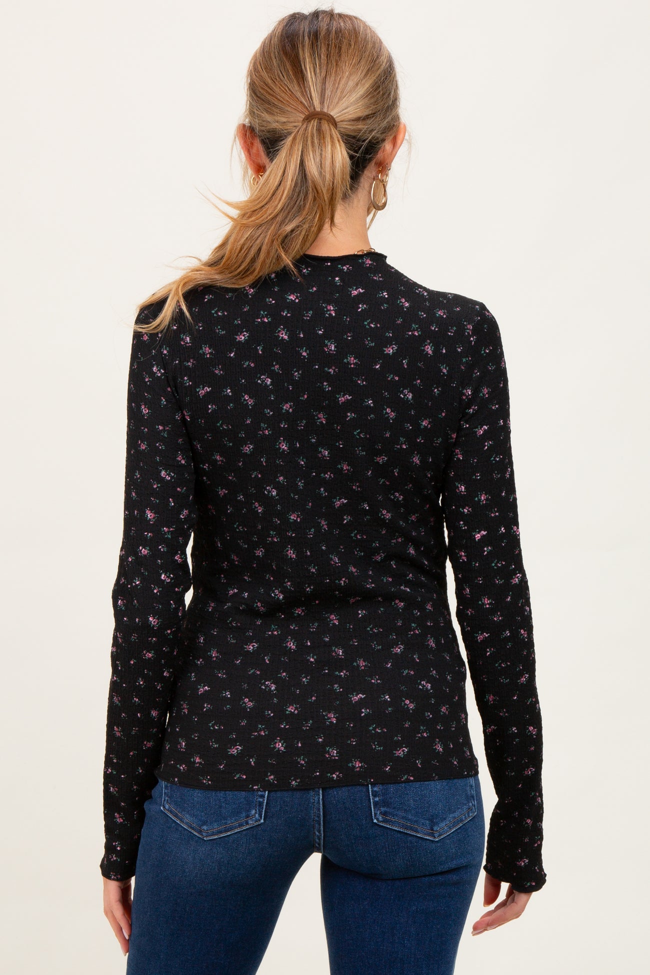 Stay stylish and comfortable throughout your pregnancy with our Black Floral Crinkled Texture High Neck Maternity Long Sleeve top. Featuring a delicate all-over floral print on a soft crinkled fabric, this top offers a flattering high neck design and gentle stretch to accommodate your growing bump. The long sleeves provide extra coverage for cooler days, while the fitted silhouette ensures you feel both cozy and chic. Perfect for everyday wear or dressed up for special occasions, this maternity top is a versatile addition to your maternity wardrobe. Pair it with your favorite jeans or leggings for effortless pregnancy style.