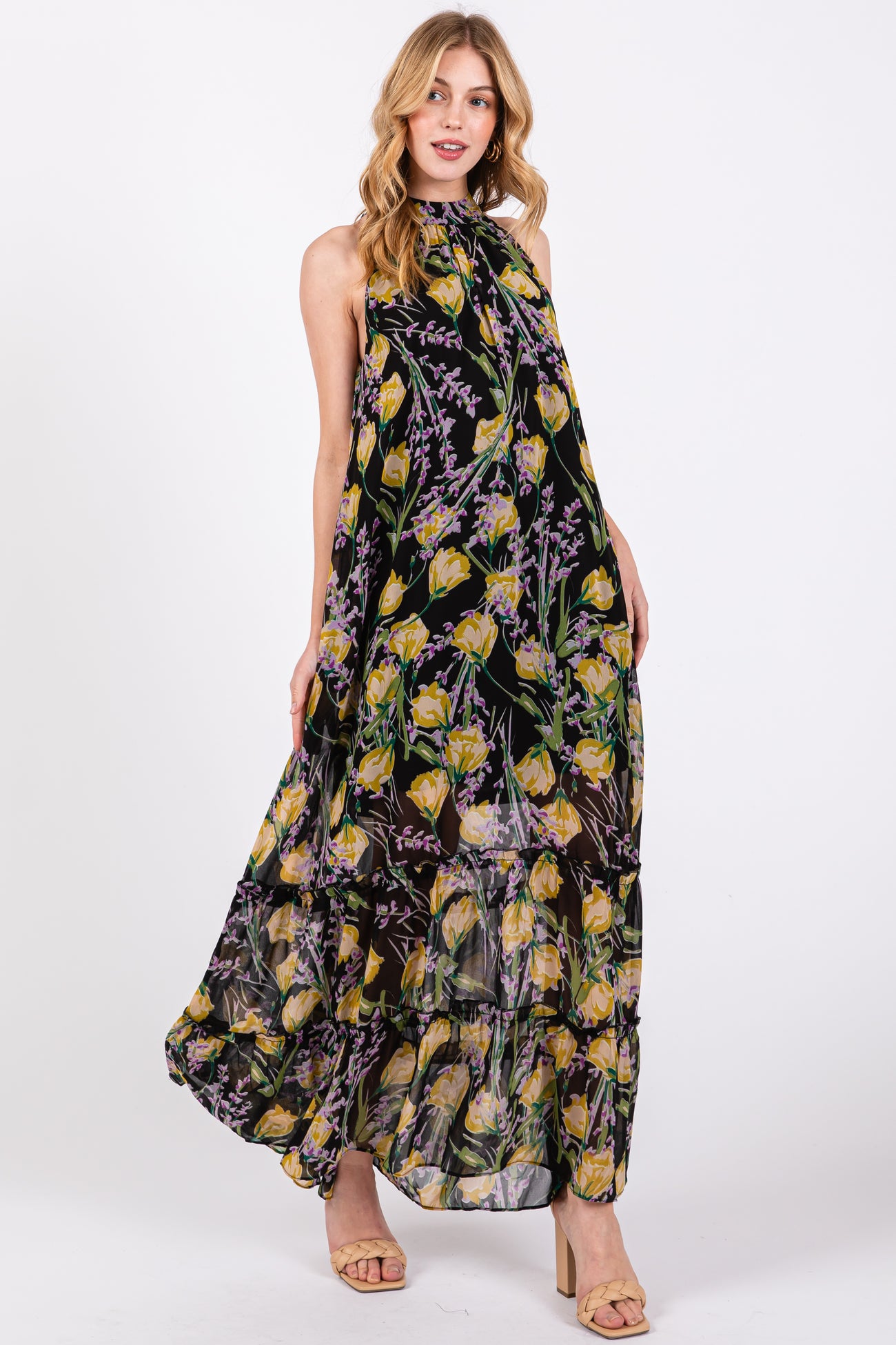 A floral maternity maxi featuring a halter neckline, a back tie closure, and a ruffle accent gathered bottom tier.