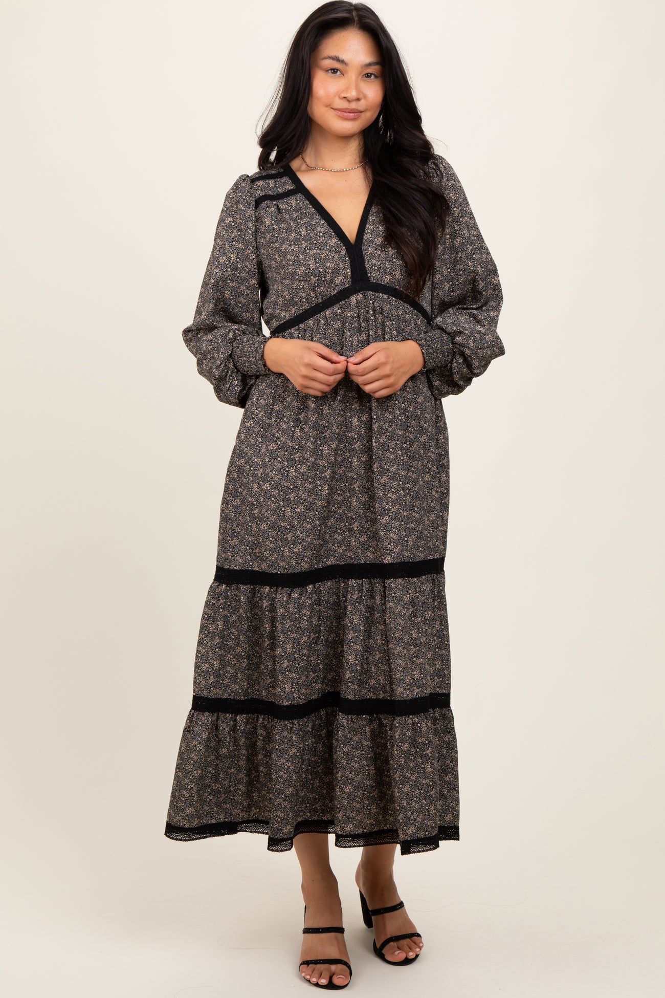 Black Floral Lace Trim Bubble Sleeve Maxi Dress