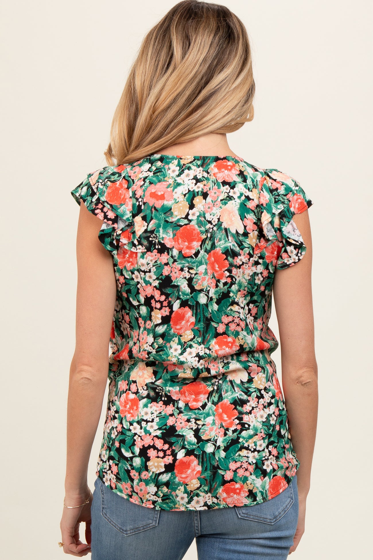 Black Floral Ruffle Cap Sleeve Maternity Top