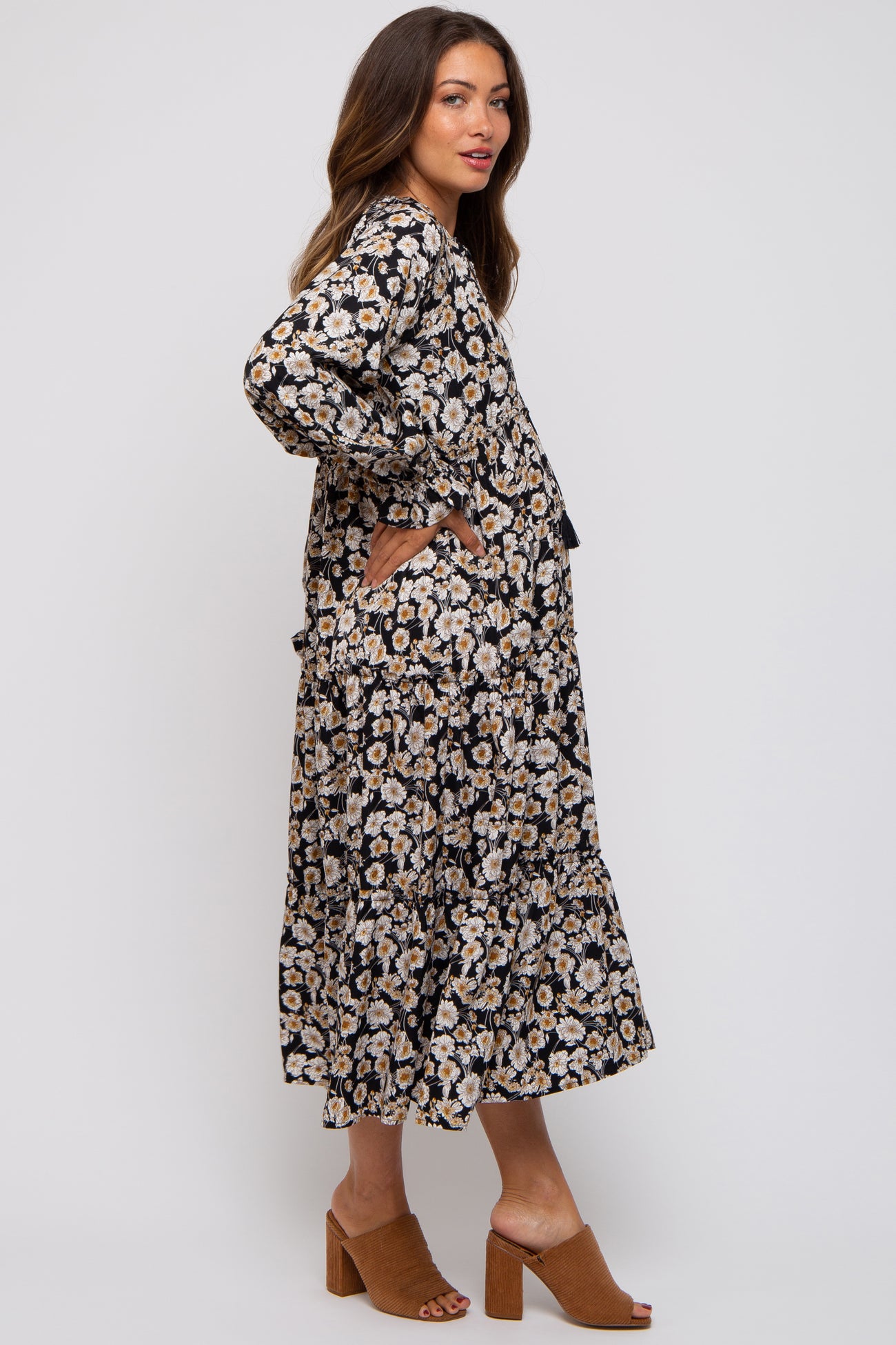 Black Floral Ruffle Neck Tiered Maternity Midi Dress