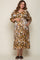 A floral print, shimmer satin maternity plus size dress featuring a wrap front v-neckline with a snap button closure, 3/4 length sleeves, a smocked elastic band at the back, side pockets and a ruffle hem.