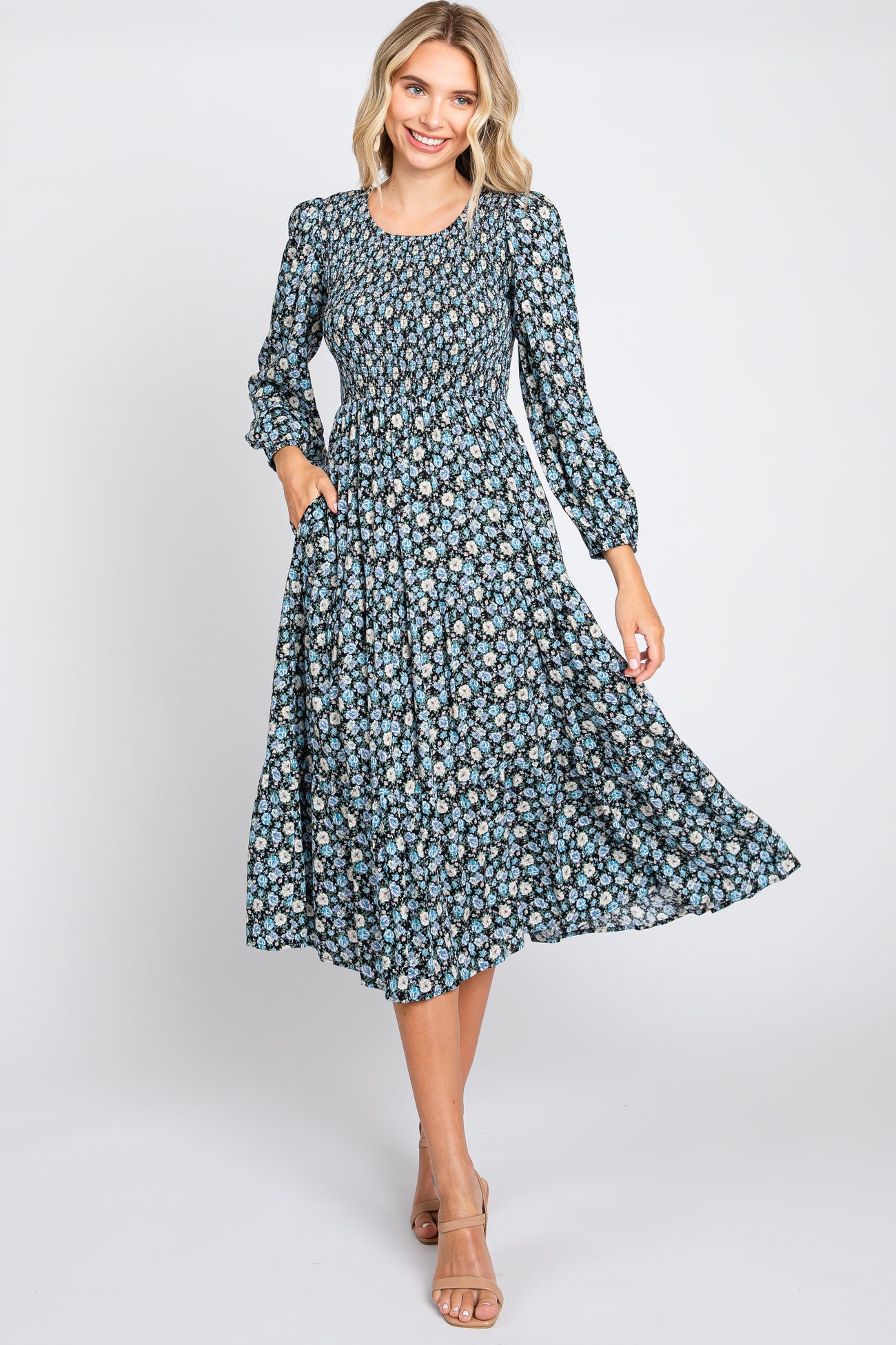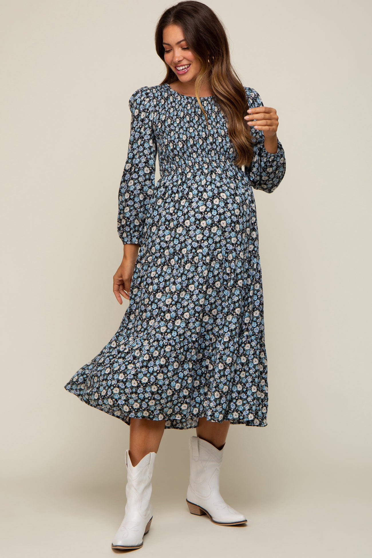 A floral print maternity midi dress featuring a rounded neckline, a smocked elastic top, 3/4 length bubble sleeves, side pockets, and a tiered skirt.