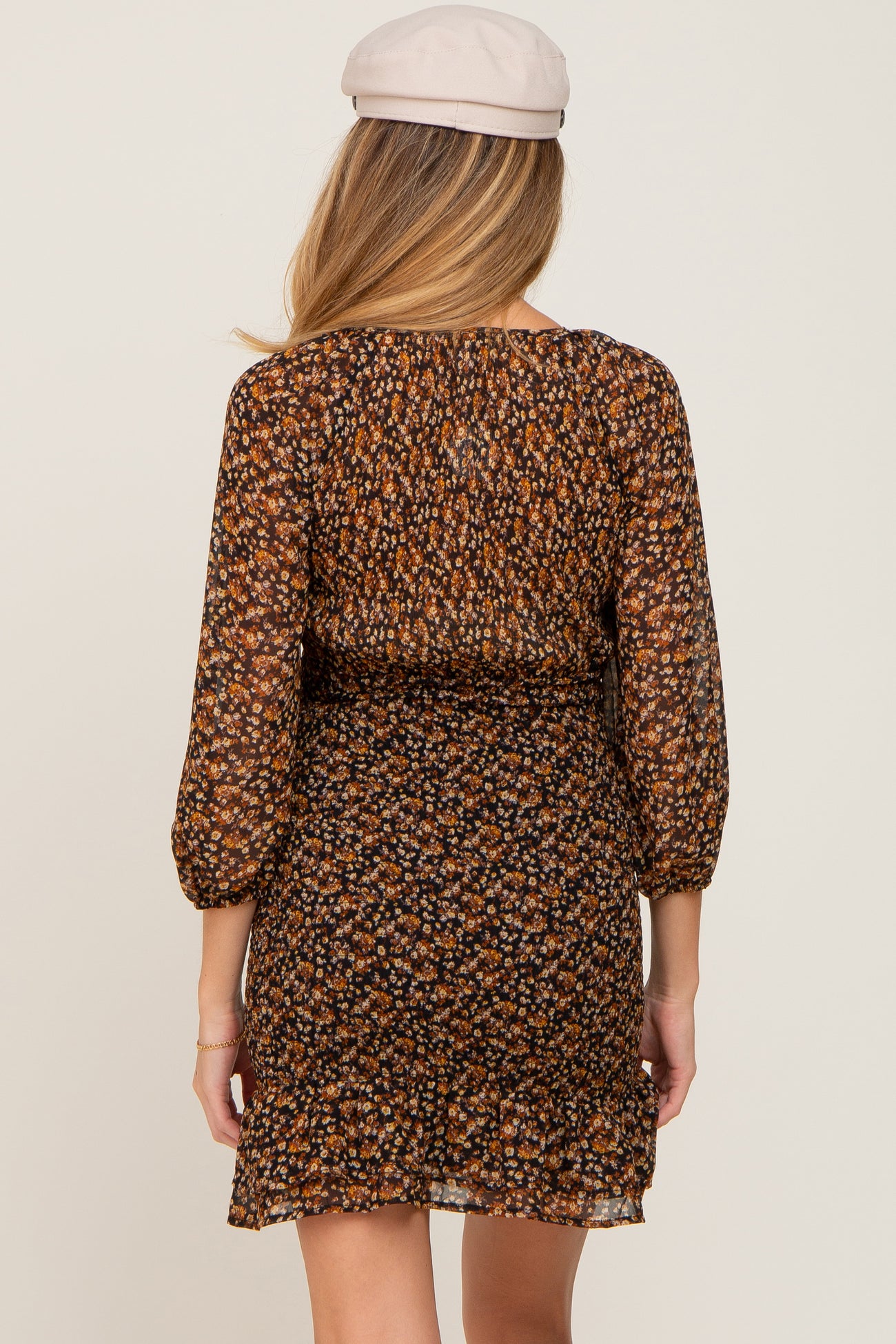 A multi-color floral maternity mini dress featuring half-length puff sleeves, a smocked skirt, a ruffle hem and a v-neckline.