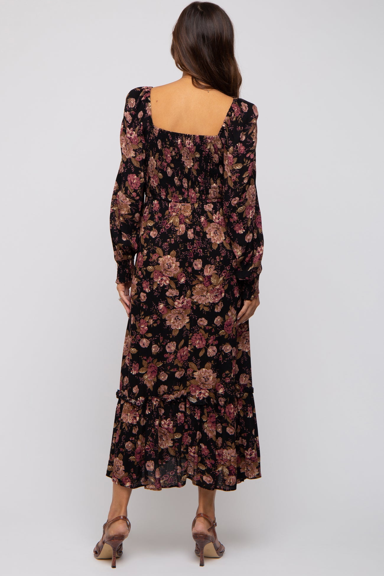 Black Floral Smocked Long Sleeve Maternity Midi Dress