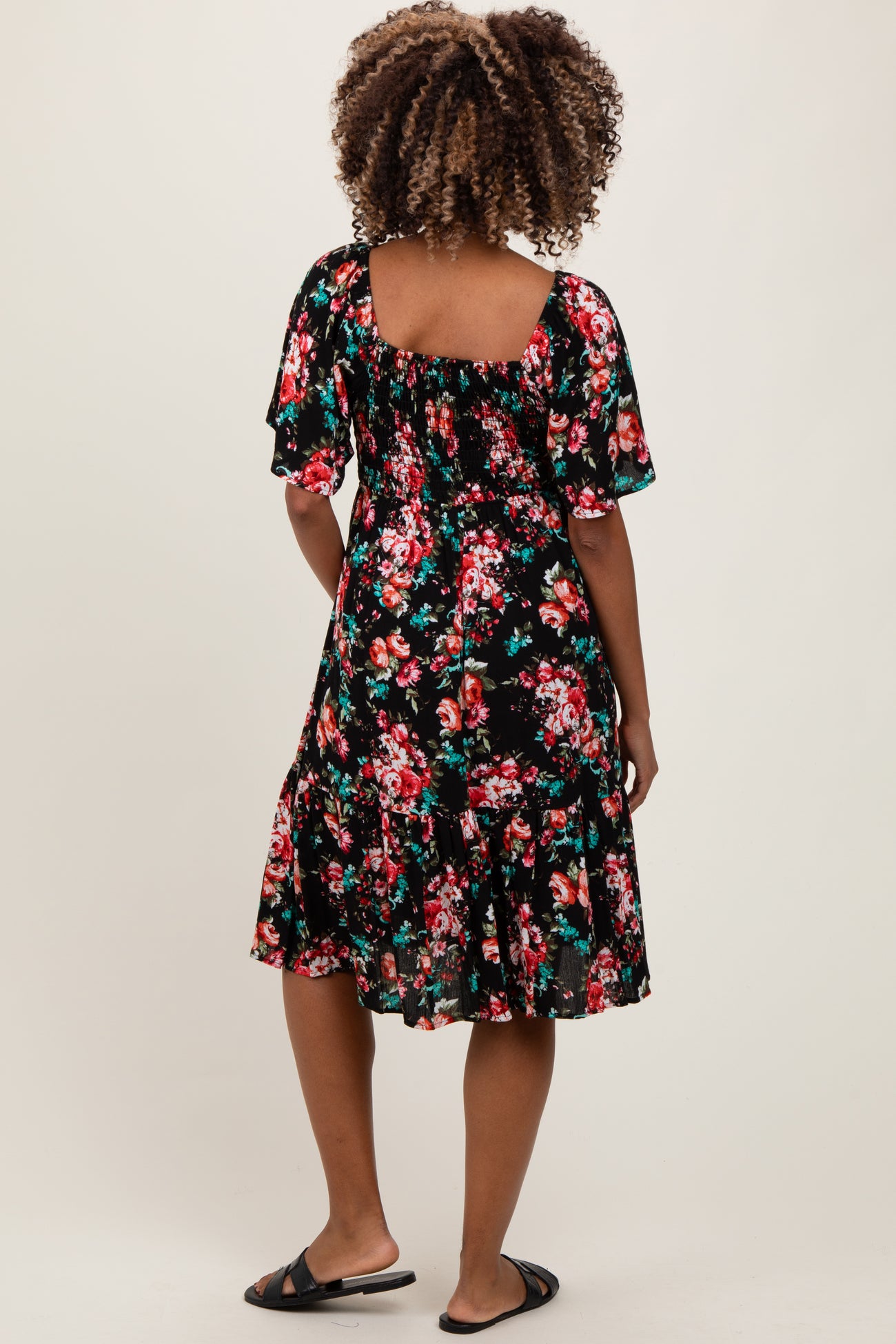 Black Floral Smocked Maternity Midi Dress