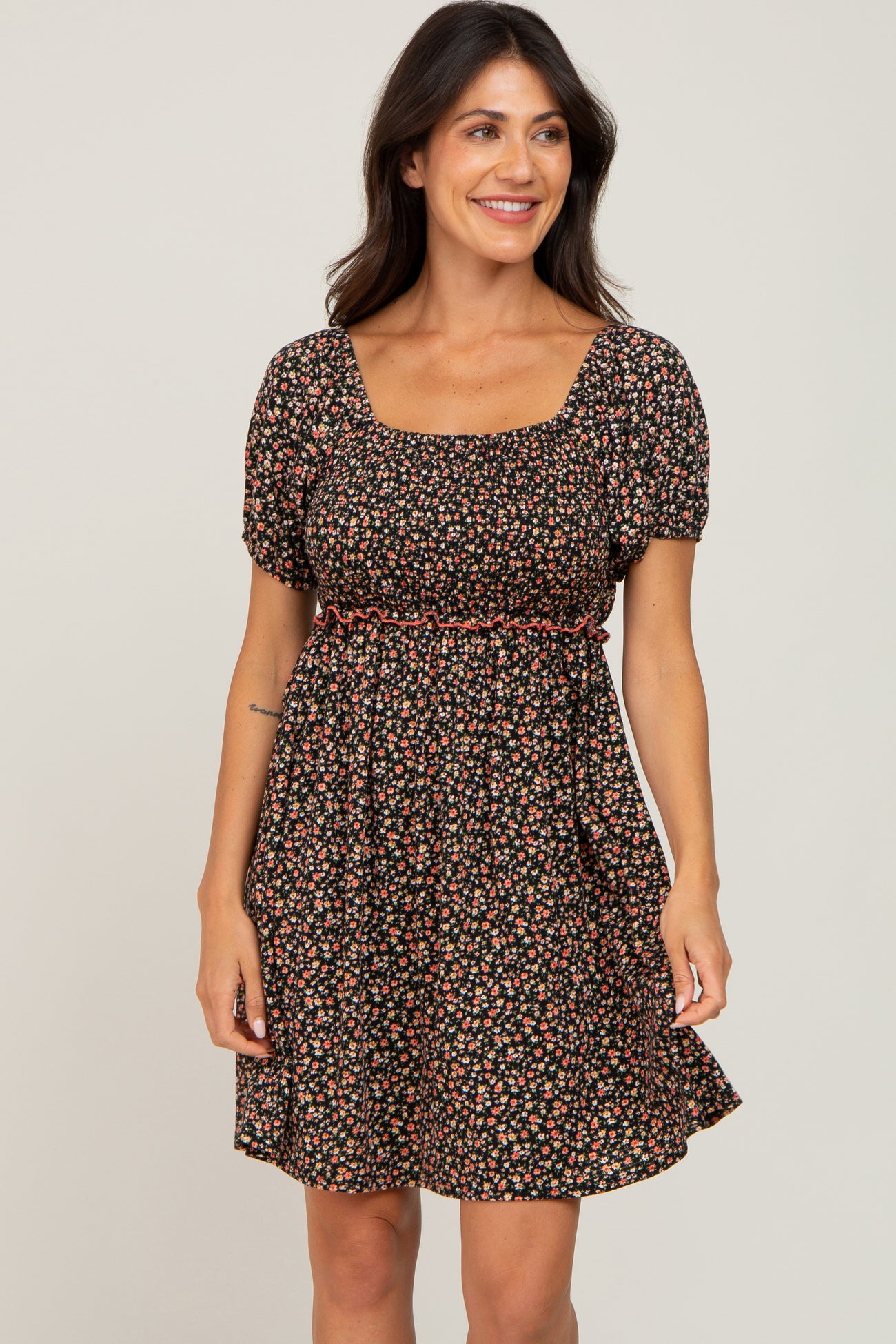 Details A floral maternity dress with short puff sleeves, a smocked top, and a ruffled waistline. Content + Care