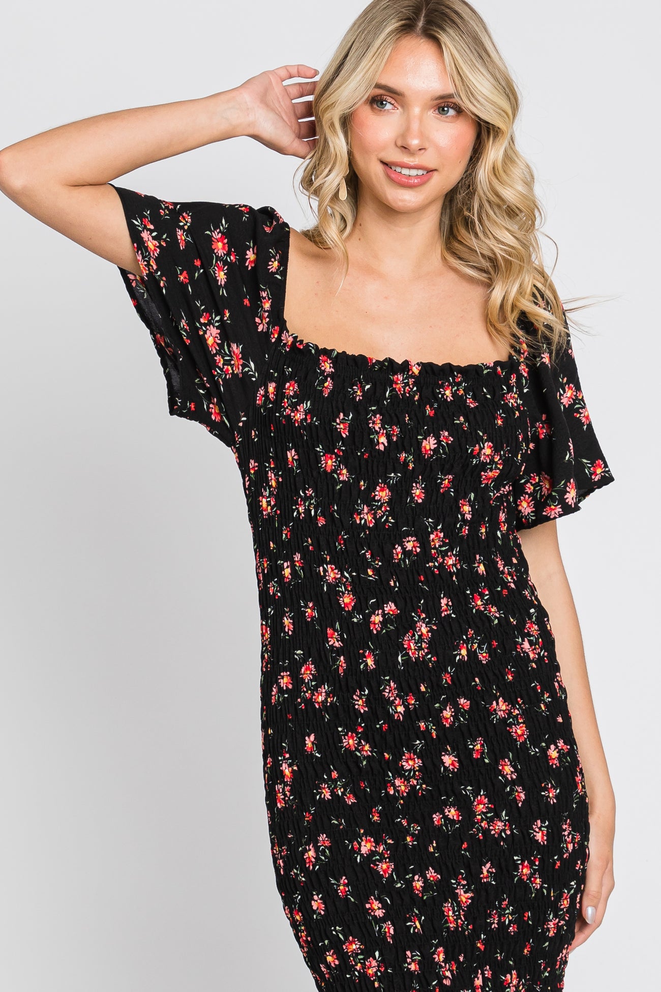 Details A floral smocked dress festering short sleeves, a ruffle hem and a square neckline. Content + Care