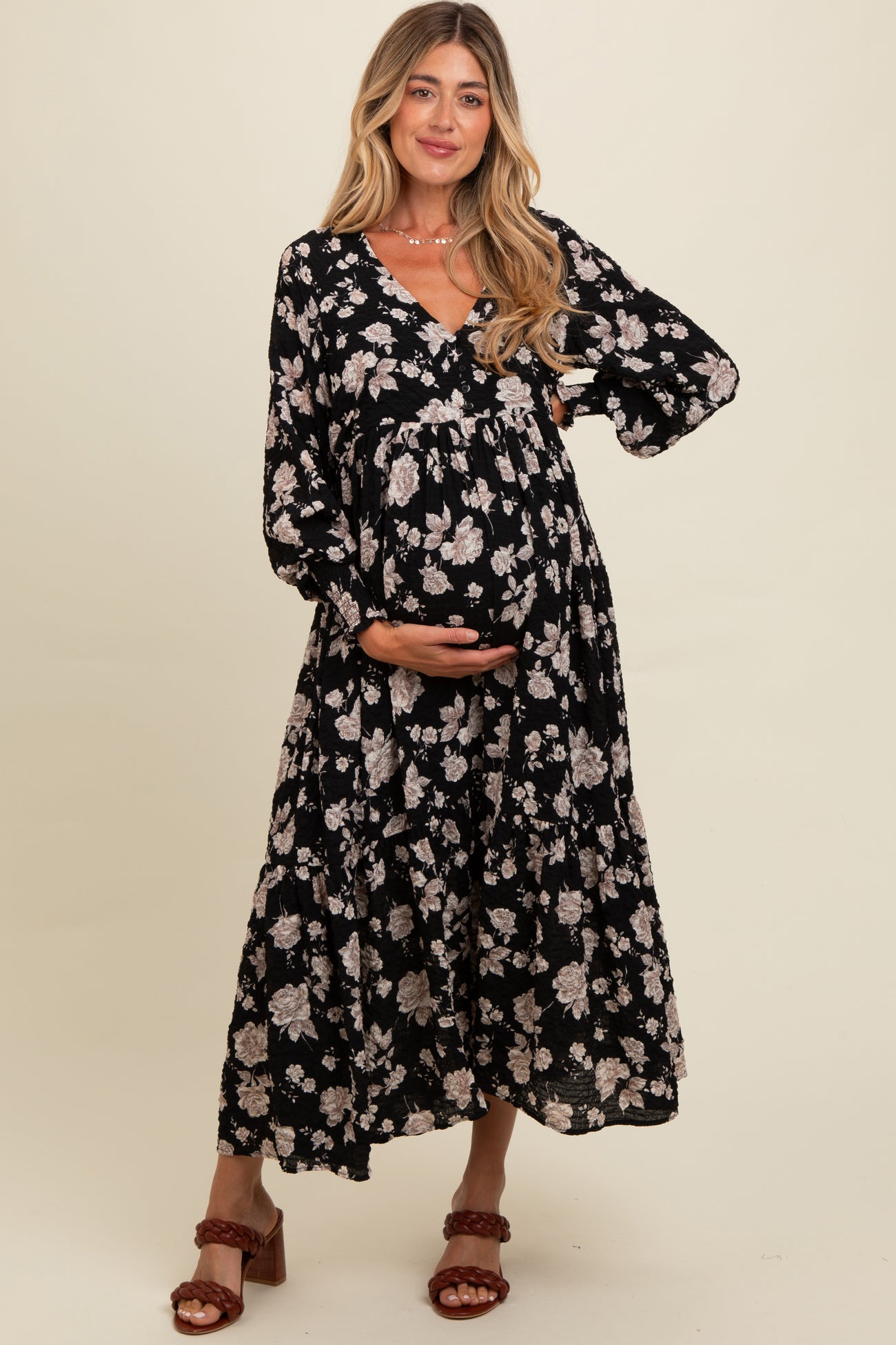 Black Floral Textured Bubble Sleeve Maternity Maxi Dress