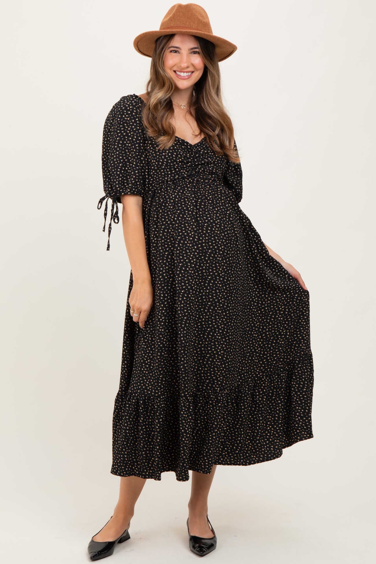 Effortlessly stylish, this Black Floral Tie Sleeve Maternity Midi Dress is designed to flatter you at every stage of motherhood. Featuring a charming floral print, this dress blends comfort and elegance with its soft, stretchy fabric and a classic midi length. The tie sleeves add a touch of playful detail, while the empire waist gives plenty of room for your growing bump. Perfect for everyday wear or special occasions, it's a versatile piece you’ll love before and after baby arrives. Pair with sandals for daytime or dress it up with heels for an evening out.