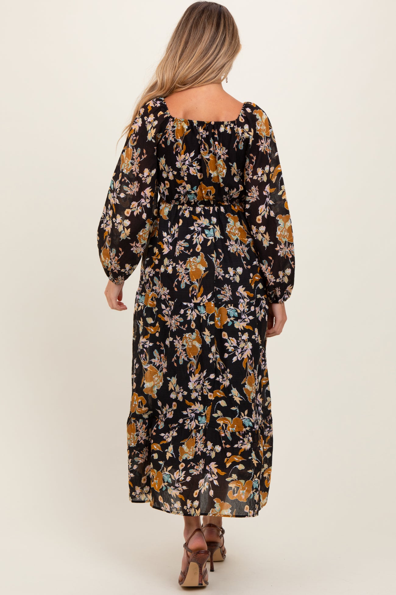 Black Floral V-Neck Long Sleeve Maternity Midi Dress