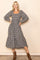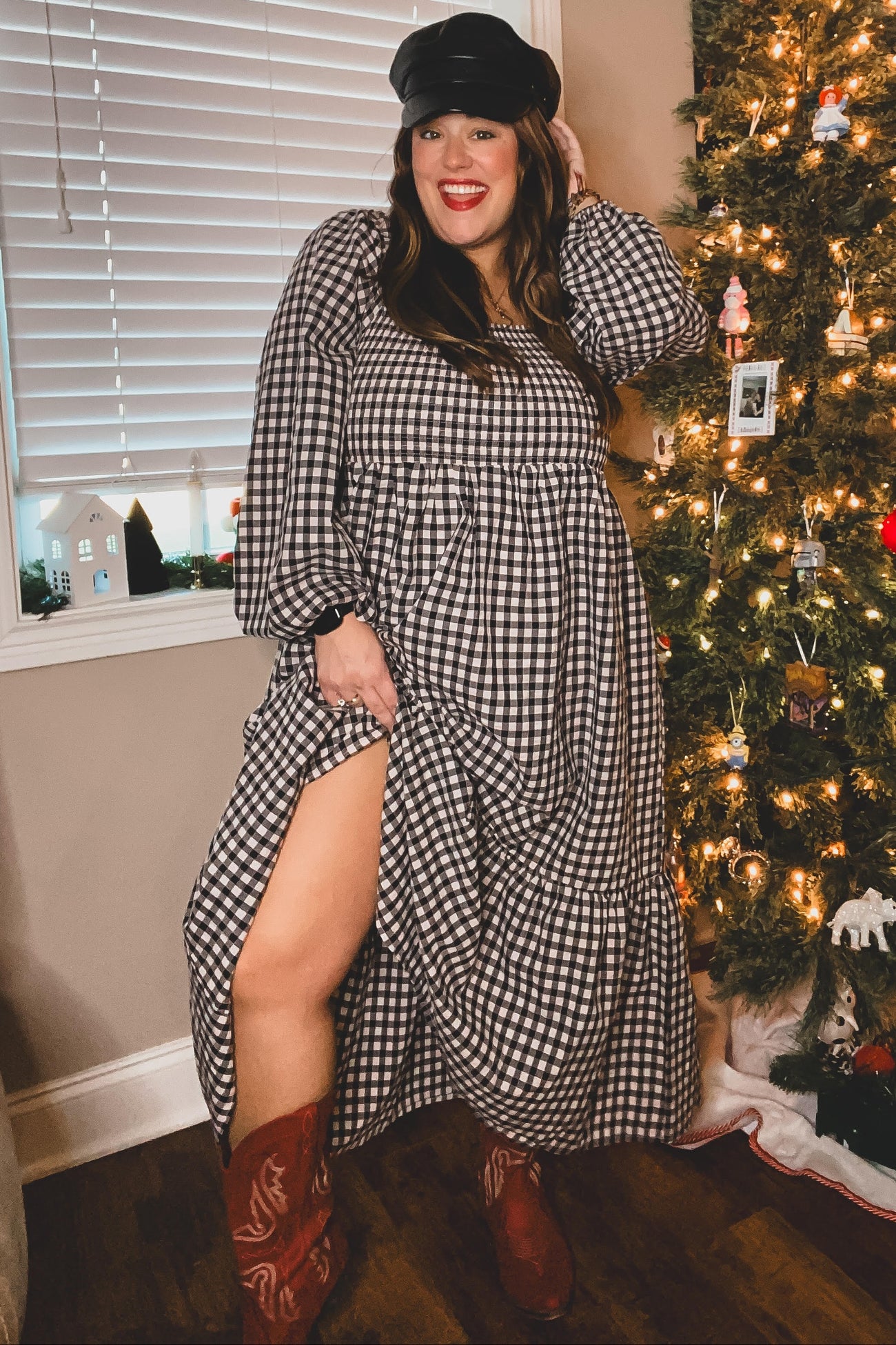 A gingham midi dress featuring a squared neckline, ruffle accents along the shoulders, long puff sleeves, a smocked top, side pockets, and a gathered bottom hem.