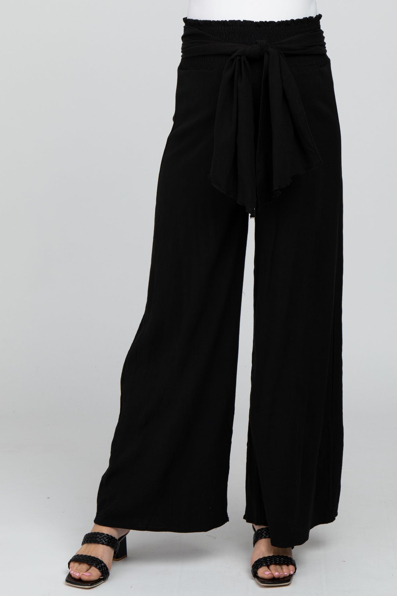 A pair of lightweight maternity pants featuring a smocked elastic waistband, an adjustable front tie and wide hem.