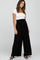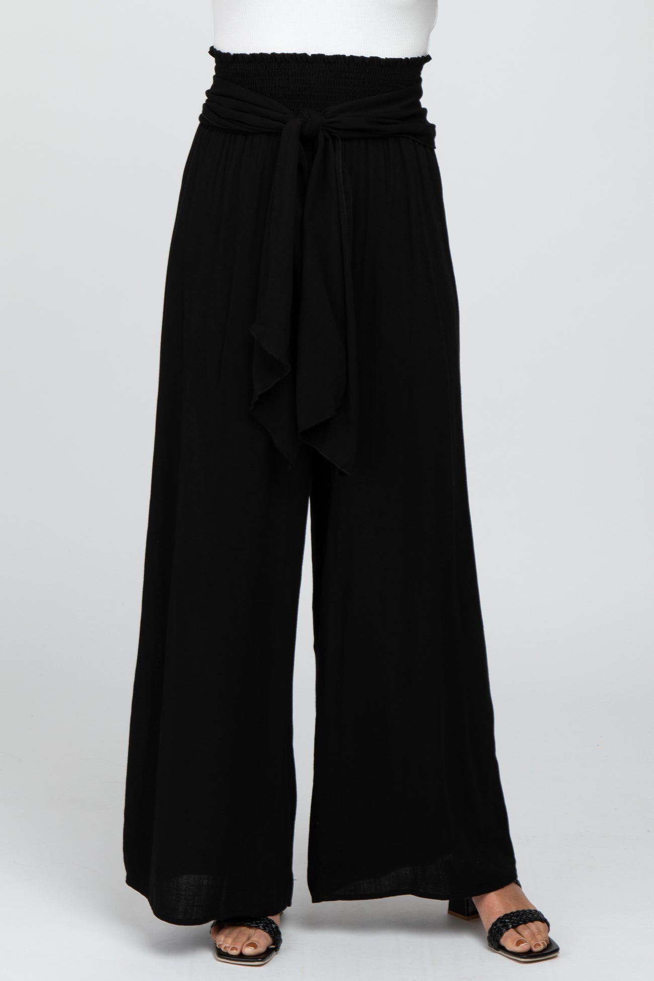 A pair of lightweight pants featuring a smocked elastic waistband, an adjustable front tie and wide hem.