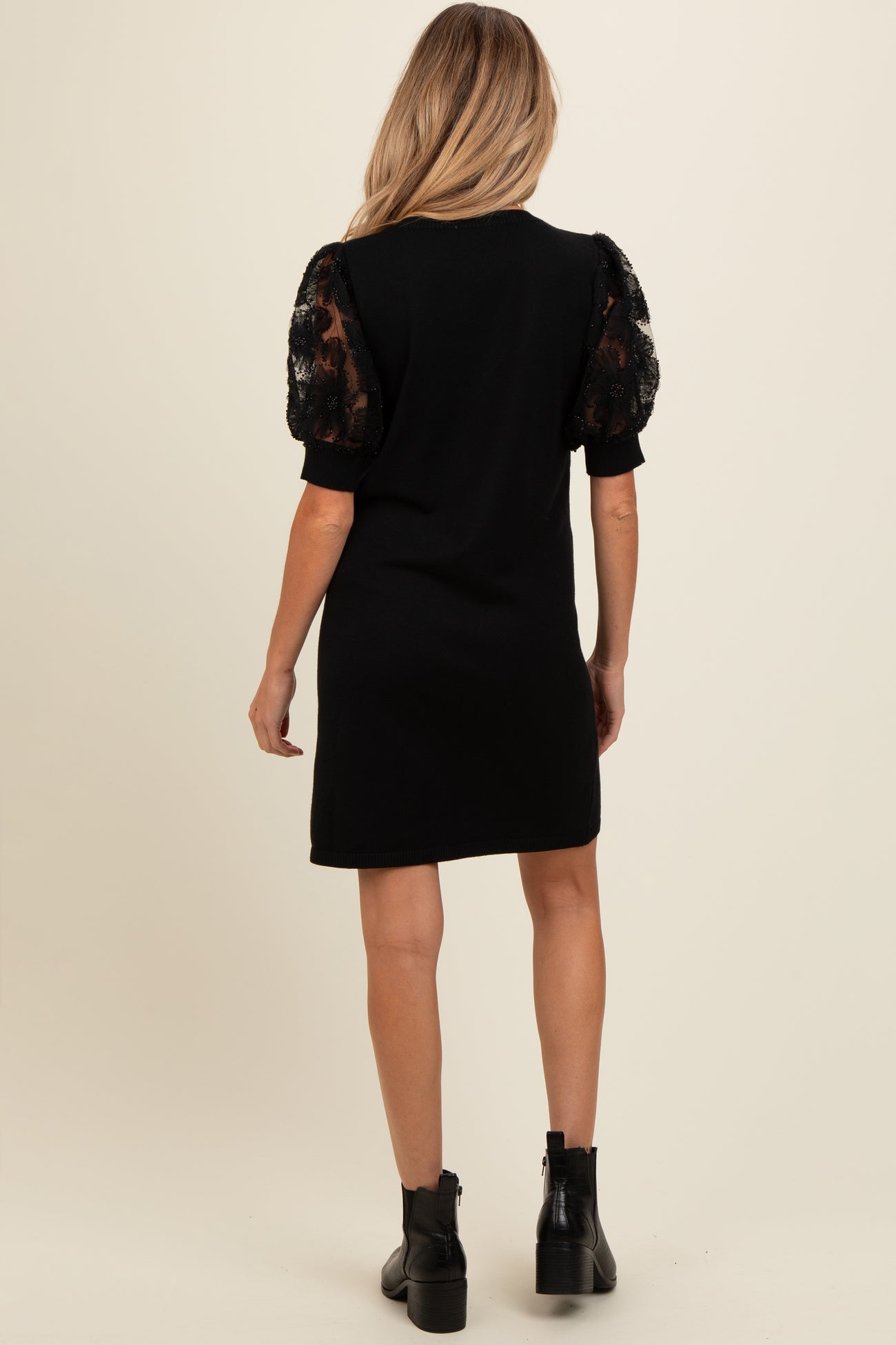 Black Knit Beaded Floral Mesh Sleeve Maternity Mini Dress