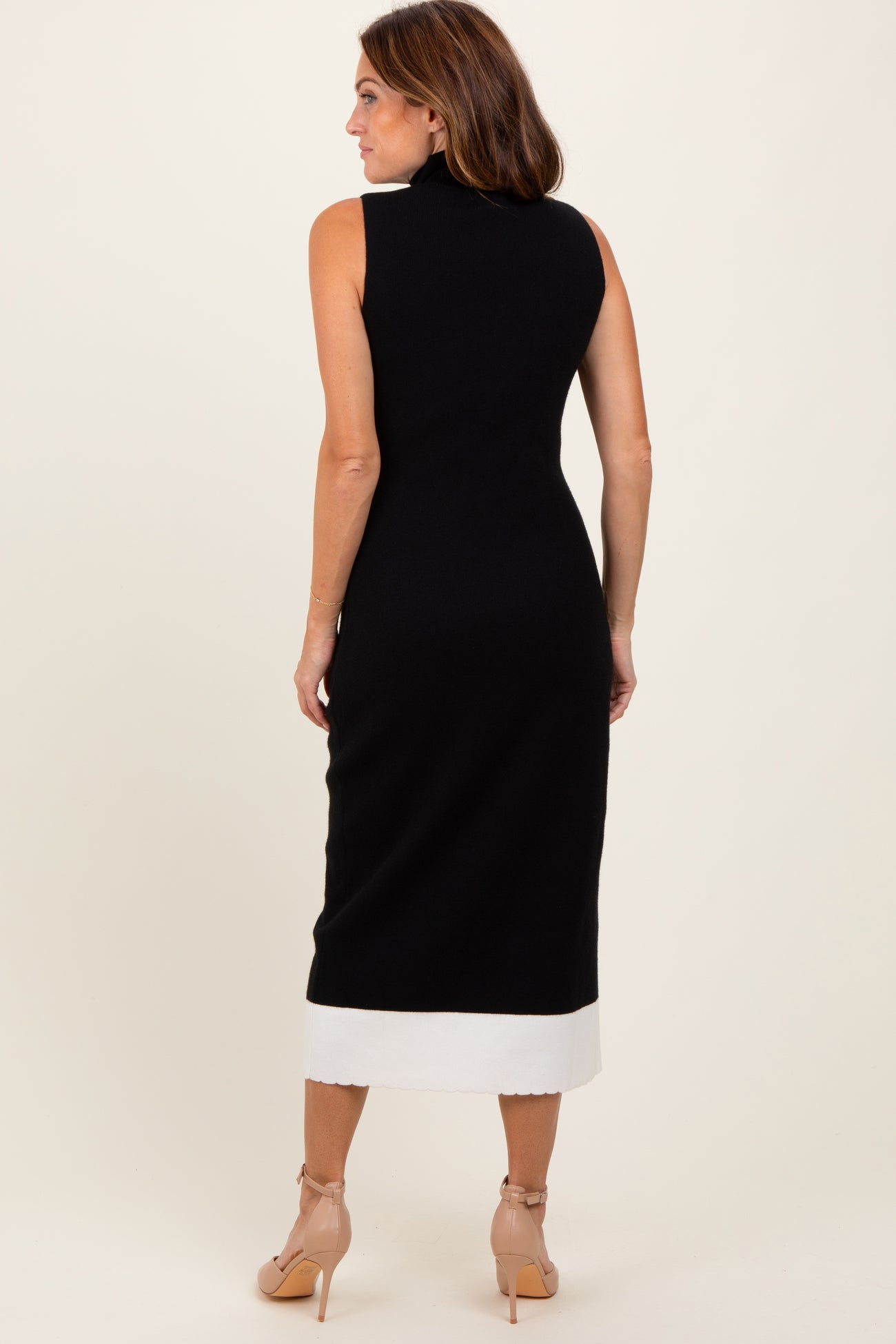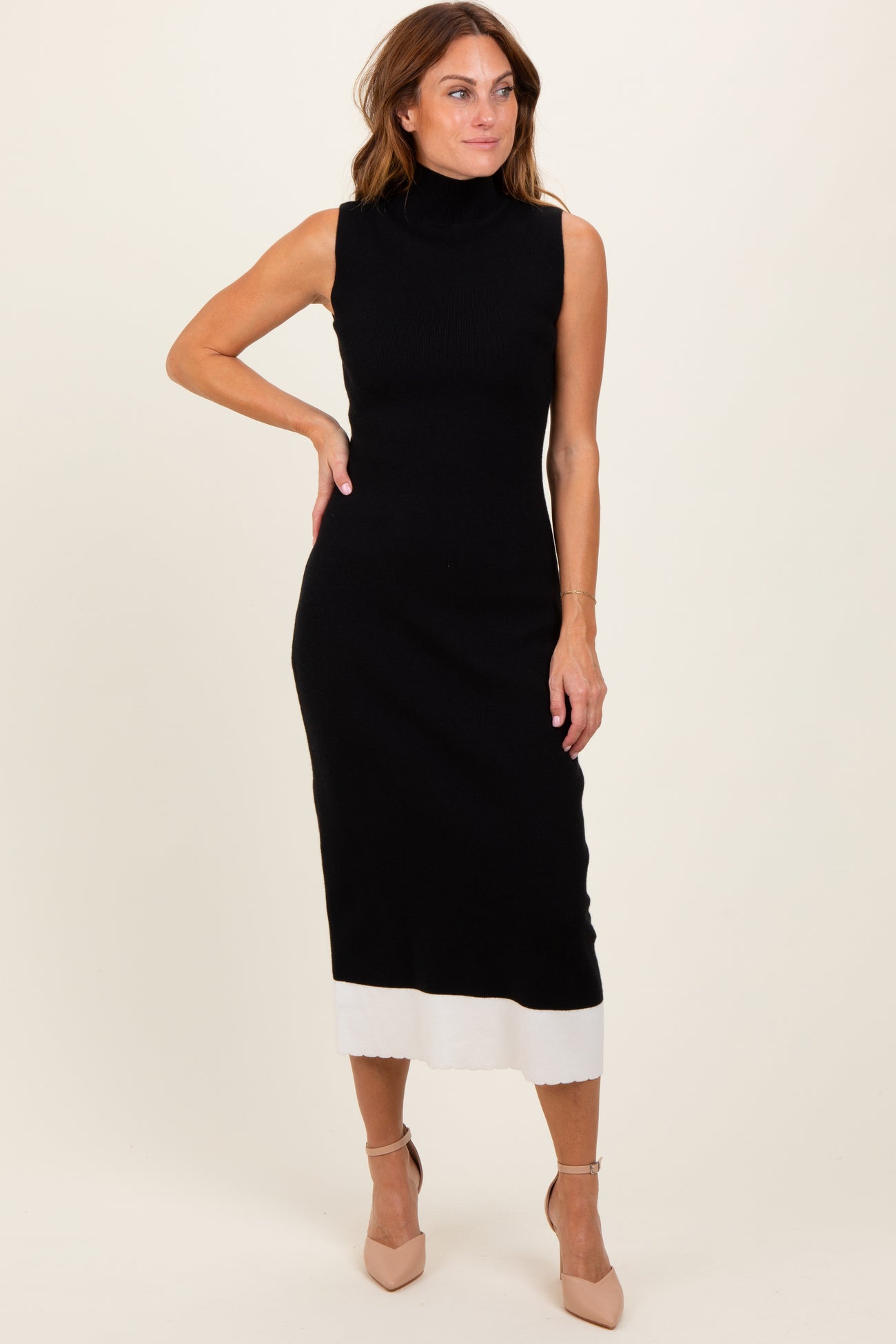 Black Knit Contrast Hem Mock Neck Sleeveless Midi Dress