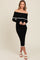 Elevate your style with this Black Knit Off Shoulder Dress, featuring chic contrast white ruffle trim along the neckline, sleeves, and hem. Crafted from a soft, ribbed knit fabric, this midi-length dress hugs your curves for a flattering silhouette. The off-shoulder design adds a touch of elegance and sophistication, perfect for date nights or special occasions. Long sleeves provide comfort and balance, while the refined ruffle details bring a playful yet polished vibe. Pair it with heels or sandals for a versatile, timeless look you'll love. Available in multiple sizes.
