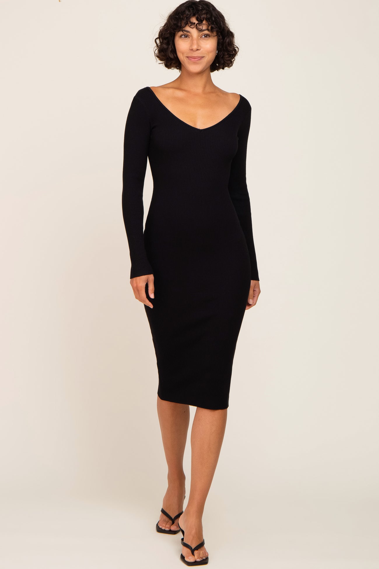 A solid ribbed knit maternity fitted midi dress with long sleeves and a wide v-neckline.