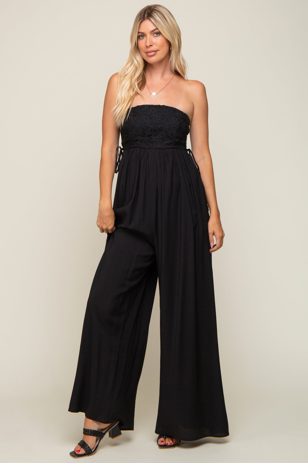 A solid strapless wide leg jumpsuit with lace overlay on top, smocking in back and side tie detail. Pocketed.