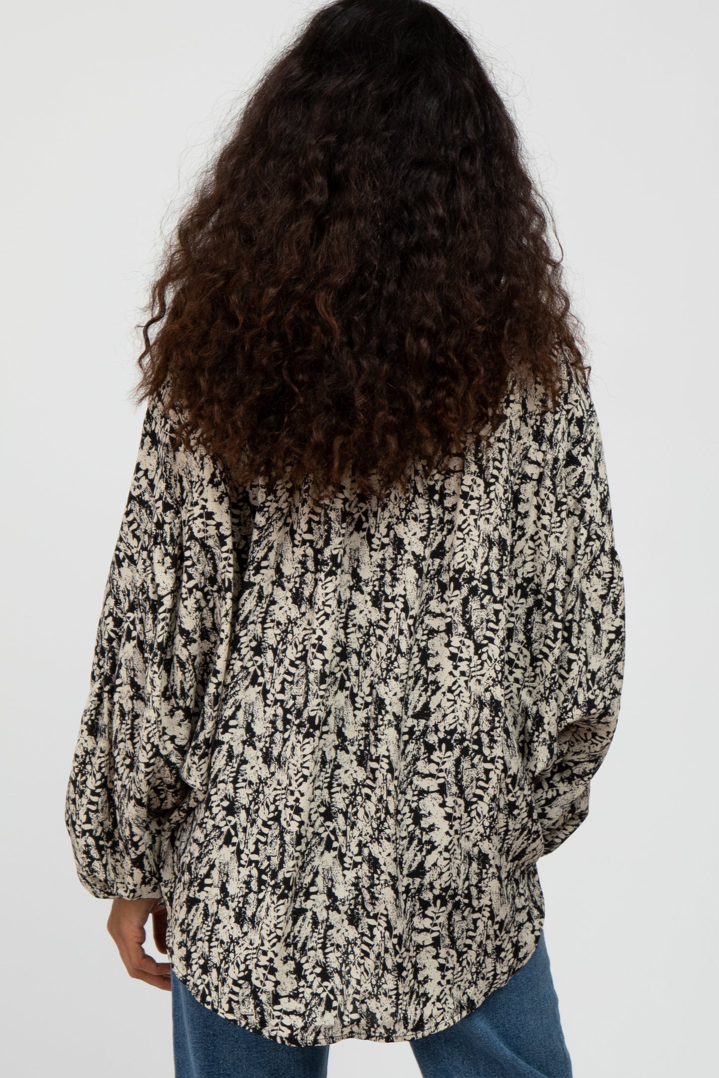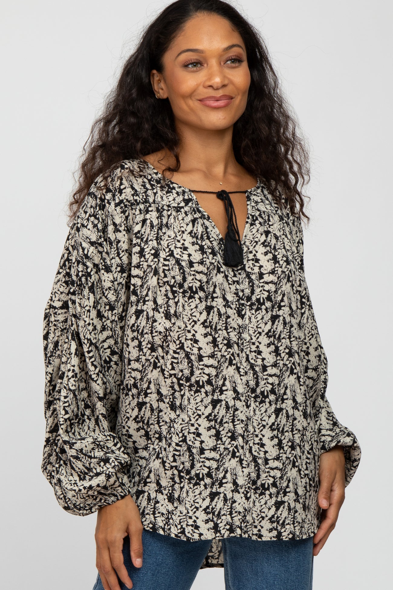 Black Leaf Print Peasant Sleeve Blouse