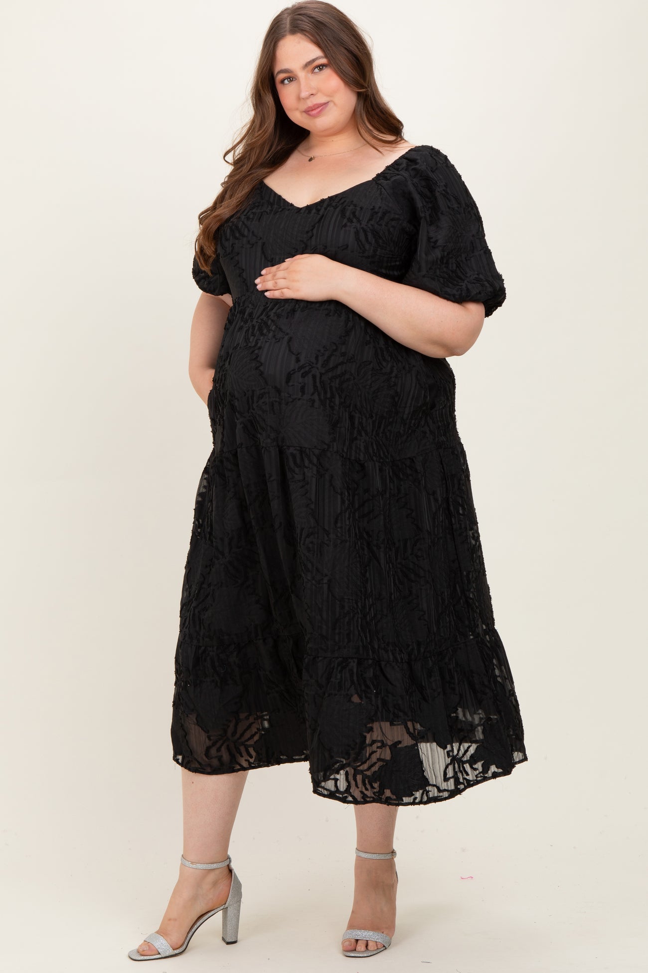 Step into elegance with our Black Leaf Textured Tiered Maternity Plus Midi Dress. Designed to flatter your growing bump, this dress features a delicate leaf-textured fabric that adds subtle dimension and style. The tiered silhouette creates a flowy, comfortable fit, perfect for any occasion—from casual outings to special events. Puff sleeves and a sweetheart neckline add a touch of feminine charm, while convenient side pockets bring practicality. Made for plus-size mamas, this midi-length dress offers comfort, breathability, and effortless style throughout your pregnancy journey.